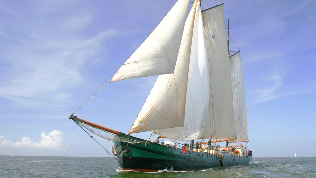 Afbeelding: de Zeilende klipper onder zeil, nu ook duurzaam door minder uitstoot als ze op de motor vaart, foto: Rederij Vooruit