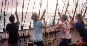 ‘Ik heb het idee dat de maatschappij nog ietsje individualistischer is geworden. Er verstrijkt tegenwoordig meer tijd voordat de groep samenhang vindt. De jongeren zijn er wel voor elkaar, maar het blijft een poos oppervlakkig. Eigenlijk moet er eerst iets aan boord gebeuren dat impact maakt. Iemand die naar huis moet vanwege ziekte of ernstige heimwee, of buitengewoon slecht weer. Iets waar je samen doorheen moet, dat bouwt een band op. Dan pas treedt er verandering op. Wij als organisatie wegen dat continu af: we willen eigenlijk alles perfect verzorgen, maar daarmee neem je ook de onverwachte dingen weg die juist effectief kunnen zijn. Het is zoeken naar de juiste balans.’