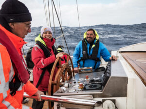 Wat een onstuimige nacht was het. De wind was gemiddeld zo’n 50 knopen, windkracht 10, met uitschieters boven de 60 knopen. Om 5 uur in de ochtend lig ik eindelijk in bed. In de nacht achter het roer staan met zo’n zware storm is een soort majestueuze ervaring. Het schip klapt scheef door die gigantische golven en met drie kleine stormzeiltjes halen we toch nog een snelheid van ongeveer 7,5 knopen en dat voor zo’n groot schip dat met volle tuigage wel acht zeilen op heeft staan. We vlíégen over de golven. We begonnen de nacht met volle maan, daardoor was er best veel licht, maar toen kwam er een maansverduistering. Zo goed als vannacht heb ik dat nog nooit eerder gezien. Er waren best veel wolken, daardoor zien we het niet telkens, maar af en toe wijken de wolken uiteen en dan, waauuuw … Er is steeds minder van de maan over en bij de volledige verduistering is alleen nog een vage zacht rode bal te zien. Pikdonker is het, terwijl het horen en zien je vergaat door de immens harde wind. Mensen dragen oordopjes om hun oren te beschermen.
