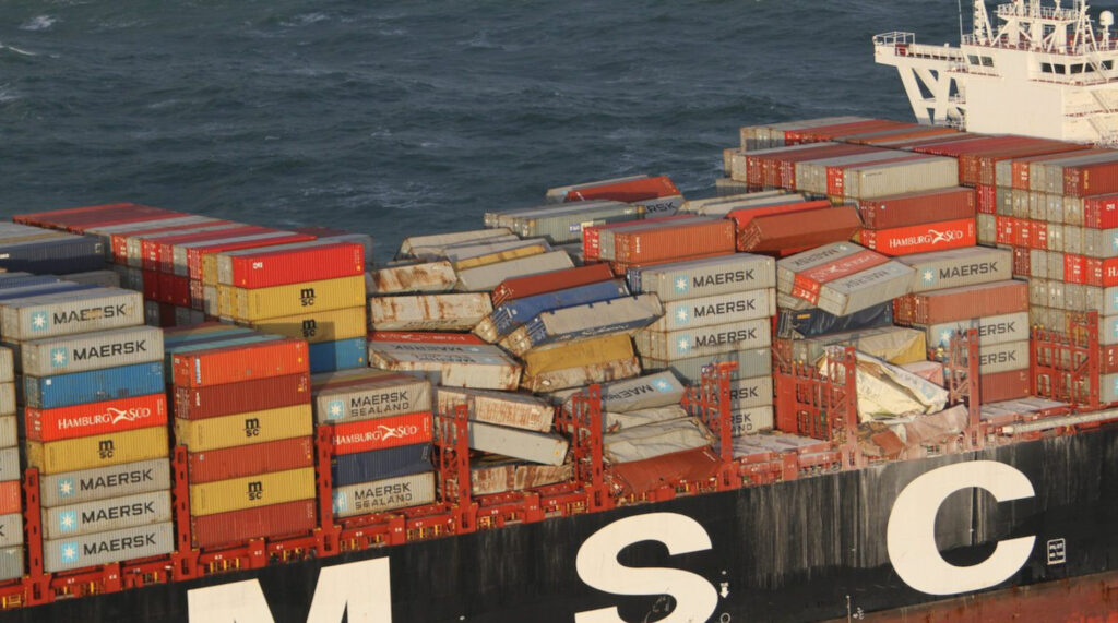 Foto: de MSC Zoe nadat het 342 containers verloor boven de Waddeneilanden.